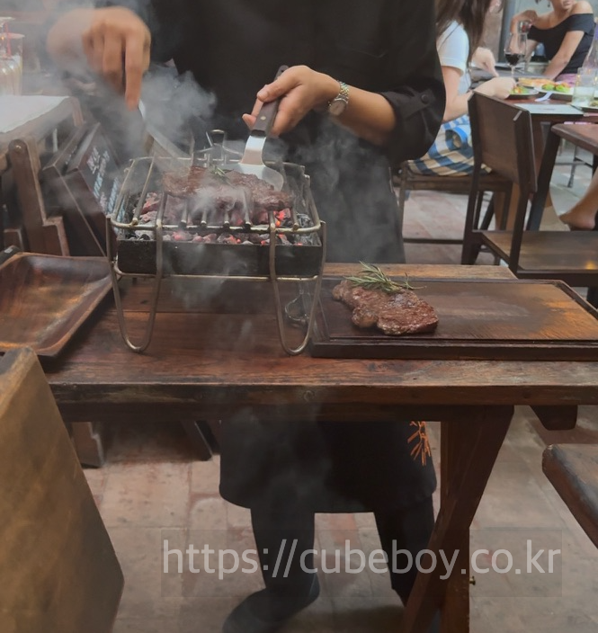 스테이크가 나오며 그자리에서 화로에서 살짝 구워서 먹기좋게 커팅을 직접 해줍니다.