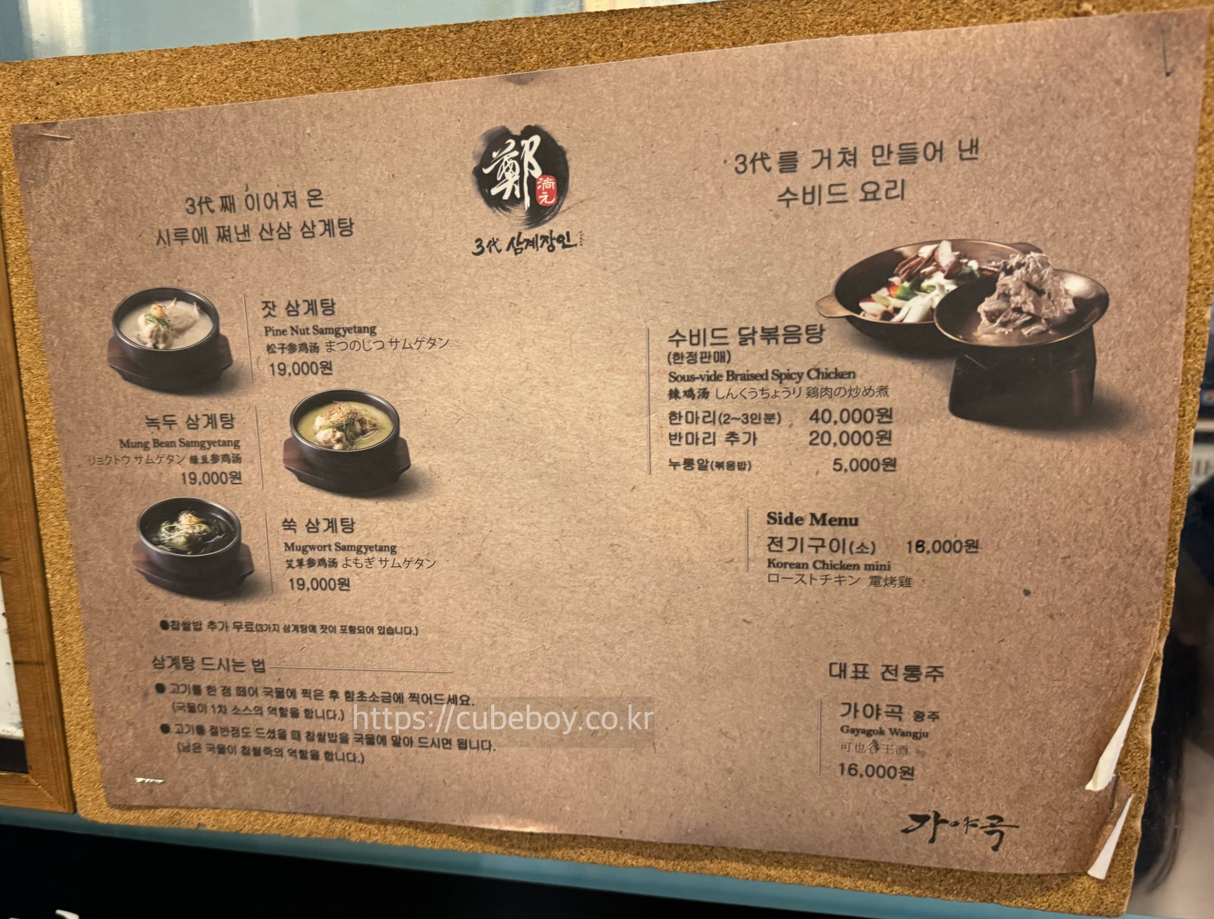 메뉴는 삼계탕 3종류와 여기의 시그니처 메뉴인 수비드 닭볶음탕이 있습니다.