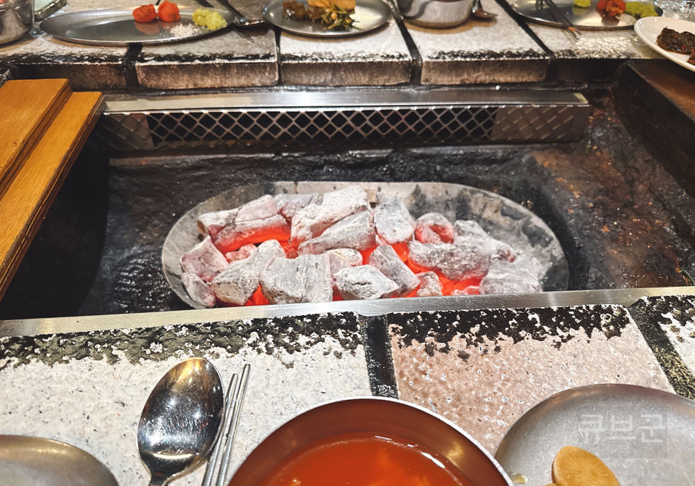 숯불과 함께 직원이 맛있게 구워주며 먹는 방법을 안내해줍니다.